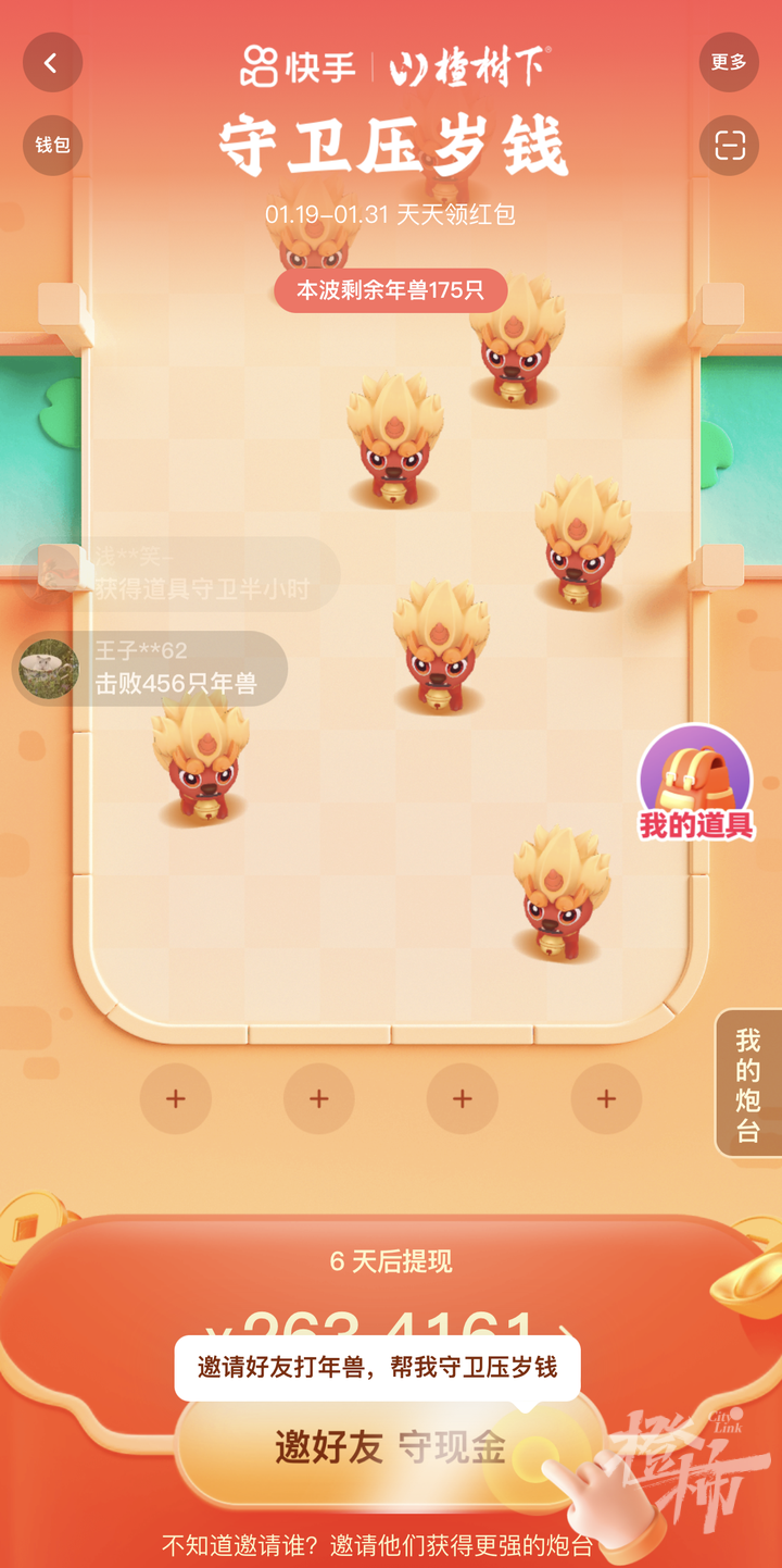 它还有个守卫压岁钱游戏,最高金额4000元,通过不断邀请好友来抵御年兽入侵(每个年兽都会偷一部分压岁钱)。在10多天的守护后,你的压岁钱就可以提现了。感觉这个游戏吧,略微有点费朋友。