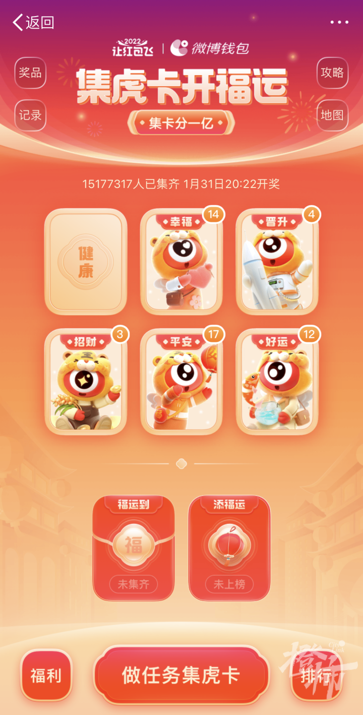 跟前两年一样,微博也来噶闹猛,集齐6种虎卡就可分1亿元。集齐后继续邀请好友获得卡片,使自己最后的卡片总数在前10万名以内,可以再获一份红包。