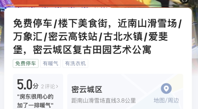 途家大数据显示,大家在预订雪场周边民宿时,最关注的设施是“温泉”“投影”“壁炉”“泡脚桶”“麻将机”等。冰雪游热潮也刺激雪场周边民宿的条件进一步改善提高,入住均价有所提升。在北京京郊,滑雪+温泉成为不少有“私汤”小院的“卖点”,平日预订均价超过千元。