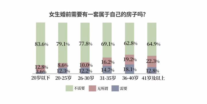 “婚前有套自己的房子”成多数女性诉求,比起婚房她们更想拥有一套自己的房子。报告显示,有74.6%的受访女性认为婚前需要拥有一套属于自己的房子,且越年轻的女性这一观念越强烈。