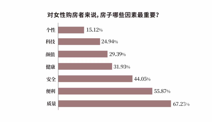 在调查“美好居住生活”的房屋因素时,报告显示,女人们考虑最多的是质量,占比67.23%;还有15.12%的女性认为“个性”最重要。在调查生活配套环节时,女人们最关心的是交通、购物、学校、医院这些满足日常生活的设施,而餐馆、文体娱、美容美发类享受生活的设施则考虑较少。