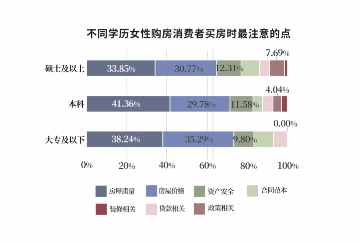 更有意思的是,高学历女性买房会花更多时间去琢磨。大专及以下学历女性,从开始看房到购房,用时一个月以内的占比为40.2%。较本科、硕士及以上学历的女性分别高出3.99个百分点和6.35个百分点;同时,学历越高的女性越关注资产安全、楼市政策等方面。