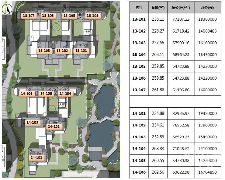 记者看到,高层房价在3.3万-4万/方不等,中间楼层的价格普遍在3.9万/方;合院户型都是200多方,单价在5.4-8.2万/方,每套总价1400万-2000万之间。
