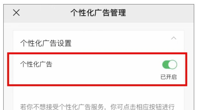 这个页面的提示信息显示:若你不想接受个性化广告服务,你可点击相关按钮进行关闭管理。若你选择关闭,你看到的广告数量不会减少,但本产品将不再向你展示个性化广告,你看到的广告将可能与你的偏号相关度降低。