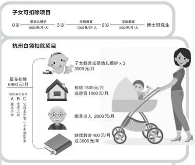 据测算,一个已婚已育三孩且需赡养老人的杭州独生子女白领,不考虑大病医疗,最多可以同时扣除五项,每月最高扣除6900元(婴幼儿照护1000元、子女教育1000元×2、租房1500元、赡养老人2000元、继续教育400元)。假如其税前月收入为1万元出头,基本上就不用交个税了。
