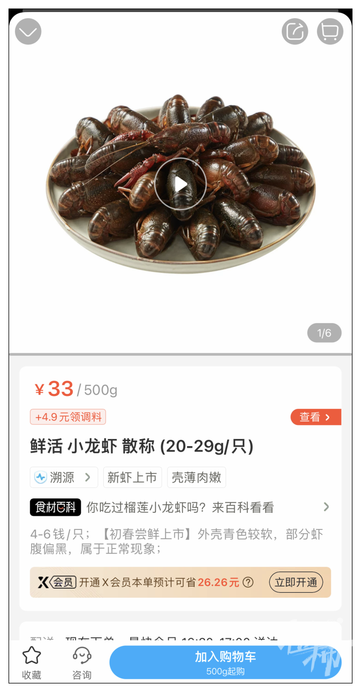 近段时间,各大买菜App也将小龙虾作为卖点。物美超市旗下生鲜App多点显示,鲜活小龙虾约27.59元/斤,价格和实体超市相差不多。盒马页面则显示近50元/斤,不过每只重30-35克,个头比较大,货源来源显示为湖北潜江;个头小一点的(20-29克/只),33元/斤。另外,制作小龙虾的料包销售也比较显眼。