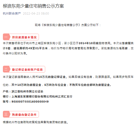 近日,杭州联合房产发布《柳浪东苑少量住宅销售公示方案》。