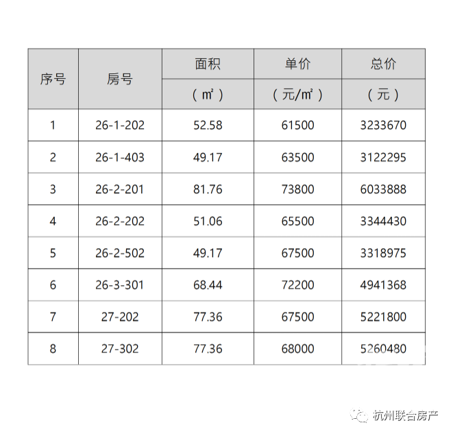 单价最低的一套房源为26-1-202,建面约52.58㎡,总价323.37万,折合单价61500元/㎡。