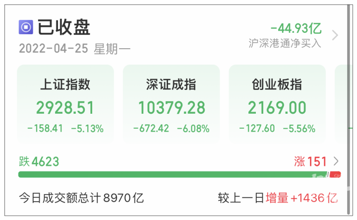 4月25日,A股三大股指低开低走,盘中跌幅均超过5%;截至收盘,上证指数跌5.13%,深证成指跌6.08%,创业板指则跌5.56%。