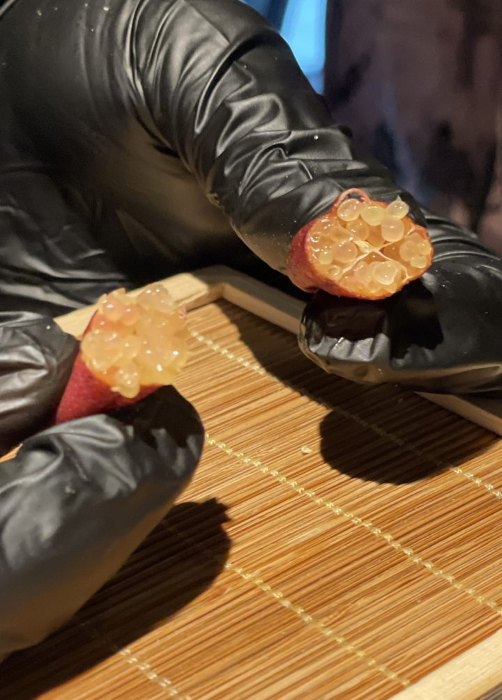 这次他们还用到一种特殊的调味品,呐,看这个手指状的柠檬,大名叫“指橙”,据说已经被澳洲当地的土著使用了上千年,不仅是作为食物,而且还用来治疗疾病。早先由于难以保存,基本上只在当地才有,现在技术发达了,指橙也出口到世界各地,成为名厨的心头好。还有人将它称为“柠檬界的鱼子酱”。既然是柠檬,就肯定会酸。将它包裹在和牛里烤,主要是用来解腻,当一嘴的肉里瞬间迸发出来一股酸意,太赞了。