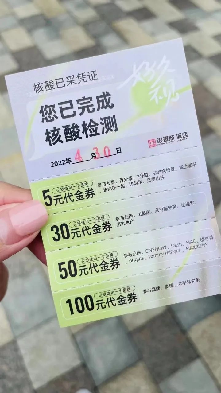 “只要是在我们这边做的核酸检测,都会收到这样一张纸质卡片。其实现在通过支付宝就可以查到(核酸)相关信息,与其说凭证,更是商场想给消费者提供一些优惠。”城西银泰城的工作人员说。渐变绿色的凭证,一半是可以撕拉的代金券,其中包括5元、30元、50元、100元四种,分别用于不同品牌品类,此外,还有一张可以兑换舒适堡的健身周卡。