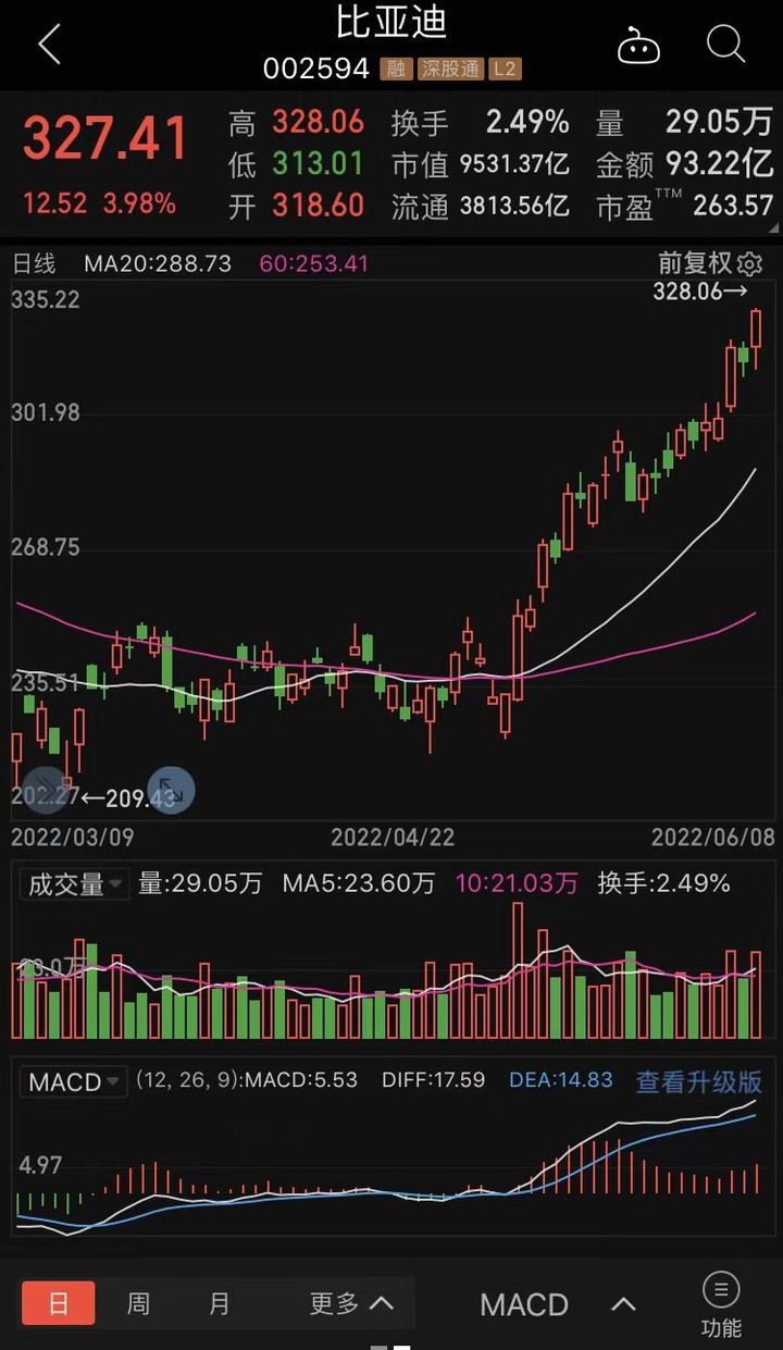 3月15日,比亚迪A股股价创下年内的最低点——209.43点,较此前的高点333.33点下跌37%;而到了今天,比亚迪股价最高反弹至321.99点,较3月15日的低点已经上涨54%,逼近历史高点,新能源汽车股的大起大落可见一斑。