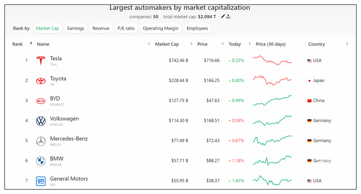 根据全球最新车企市值排行榜,中国汽车制造商比亚迪反超大众集团排名第三,总市值达到1278 亿美元(约合人民币8690亿元)。目前,特斯拉仍是全球市值第一车企,以7424.6亿美元(约合人民币5万亿元,相当于2.16个贵州茅台或者3个工商银行)遥遥领先其他车企。丰田集团紧随其后排名第二,总市值为2284.4亿美元,仅为特斯拉市值的30%。排名第三的是比亚迪,总市值为1277.5亿美元,也是前十排行榜中唯一一家中国车企。第四至十名分别为:大众集团、梅赛德斯-奔驰、宝马集团、通用汽车、福特汽车、Stellantis集团、本田汽车。