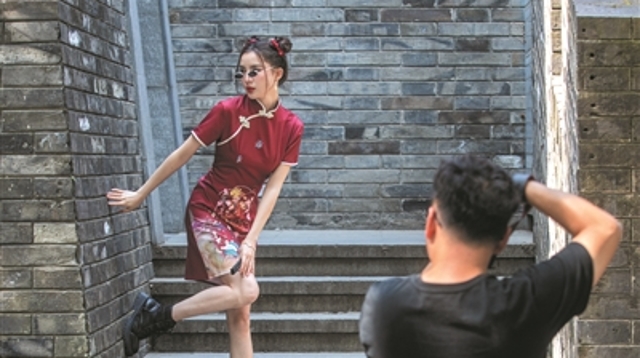 在鼓楼下拍照的姑娘
