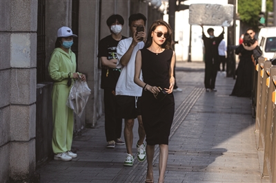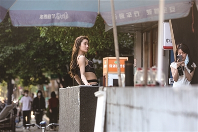 工行门口有一块很大的门牌石,不时可以看到年轻的姑娘小伙在门牌石后面换衣服,一个场景,一天可能要换拍几十套服装。