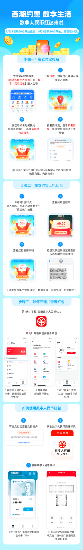 为进一步提升杭州市民对数字人民币的知晓度和接受度,引导市民体验数字人民币、培养使用习惯,充分发挥数字人民币促进消费、服务民生的优势作用,杭州市西湖区人民政府联合工商银行杭州分行、农业银行杭州分行、中国银行杭州分行、建设银行杭州分行、邮储银行杭州分行、交通银行杭州分行、招商银行杭州分行、网商银行八家运营机构将于近期开展“西湖约惠·数字生活”数字人民币红包促消费活动,共计发放两轮数字人民币红包。