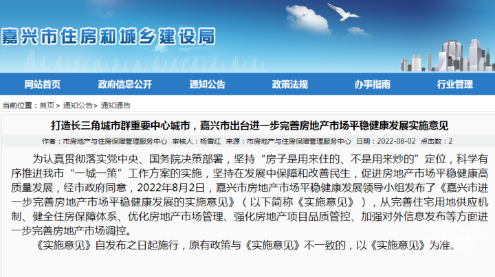都市快报讯 2022年8月2日,记者从嘉兴市住房和城乡建设局网站了解到,嘉兴市房地产市场平稳健康发展领导小组发布了《嘉兴市进一步完善房地产市场平稳健康发展的实施意见》(以下简称《实施意见》),从完善住宅用地供应机制、健全住房保障体系、优化房地产市场管理、强化房地产项目品质管控、加强对外信息发布等方面进一步完善房地产市场调控。