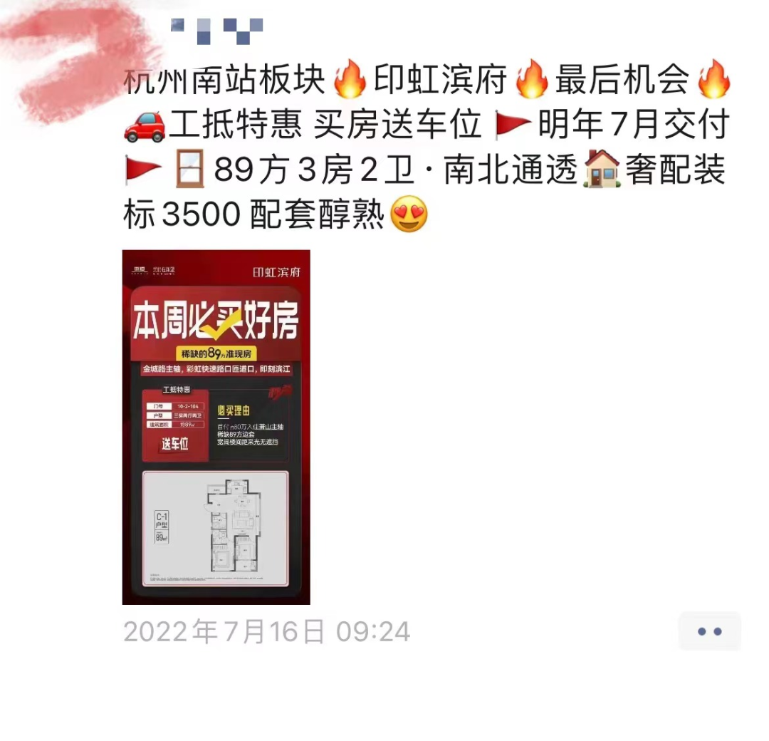 部分连房子去化都不是很理想的项目,则打出买房子送车位的噱头。如临安的东投悦荣府、萧山的印虹滨府。