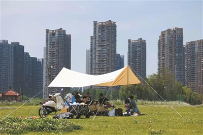 国庆假期第一天中午过后,位于钱塘江边的钱江世纪公园的大草坪上,已经陆陆续续搭上了不少帐篷。杭州的王先生一家人直奔公园中心的BLACKDEER PARK,这是一家户外用品集合店。他要采购一些露营装备,这个假期要跟女儿班上的同学去千岛湖进行三天两晚的亲子露营,这将是他们第一次在户外过夜。