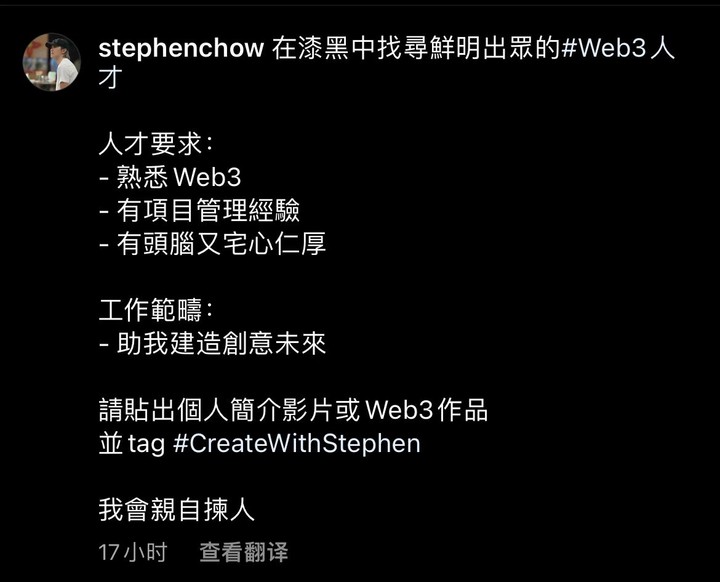 昨天半夜发布的这则招聘信息,这样写道:“在漆黑中寻找鲜明出众的Web3人才。人才要求:熟悉Web3,有项目管理经验,有头脑又宅心仁厚。工作范围:助我建造创意未来。”应聘者需要提交个人简介影片或者Web3作品,周星驰表示会亲自选人。