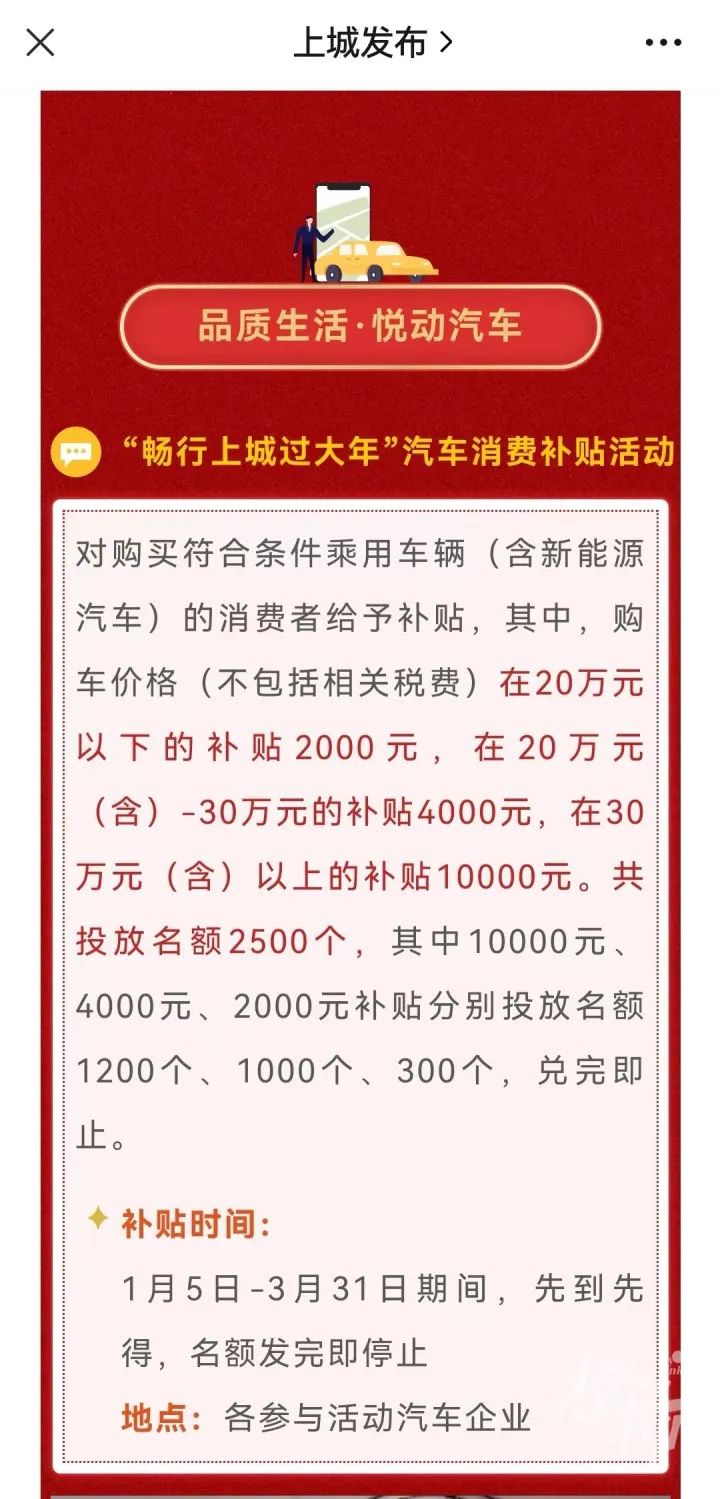1月7日,上城区也宣布,为进一步挖掘新年消费潜力,“抢先机、拼经济”实现开门红,上城区推出欢购上城迎春消费季活动。一系列活动中包括“畅行上城过大年”汽车消费补贴活动,对购买符合条件乘用车辆(含新能源汽车)的消费者给予补贴,其中购车价格(不包括相关税费)在20万元以下的补贴2000元,在20万元(含)-30万元的补贴4000元,在30万元(含)以上的补贴10000元。此次共投放2500个补贴名额,其中10000元、4000元、2000元补贴名额分别为1200个、1000个、300个,兑完即止。本次补贴从1月5日起,到3月31日结束,先到先得,名额发完即停止。