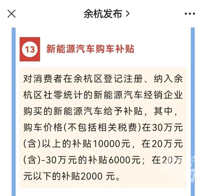 同样,在余杭区为冲刺新年经济“开门红”发布的36条措施中,也包含了新能源汽车补贴政策。余杭区宣布,1月1日至3月31日期间,在余杭区购买新能源汽车最高补贴1万元。消费者必须是在余杭区购车,且新能源汽车经销企业必须是在余杭区登记注册、纳入余杭区社零统计的企业。其中,购车价格(不包括相关税费)在30万元(含)以上的补贴10000元,在20万(含)-30万元的补贴6000元,在20万元以下的补贴2000元。