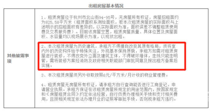 不过需要注意的是,本次租赁房屋为历史建筑,承租方不得擅自改变其原有格局,须将室内外的历史构件给予特殊关注,外观基本保持原貌,承租方如需对租赁房屋进行装修,不得改变外立面及建筑主体,不得破坏墙体,走线只能走明管,需将装修方案经消防及政府相关职能部门审批同意及报出租方备案后实施。
