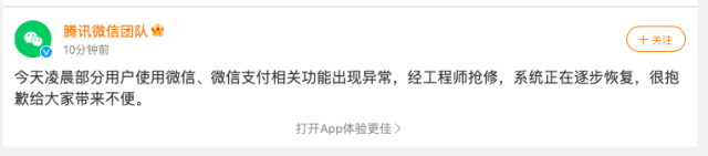 今天凌晨部分用户使用微信、微信支付相关功能出现异常,经工程师抢修,系统正在逐步恢复,很抱歉给大家带来不便。
