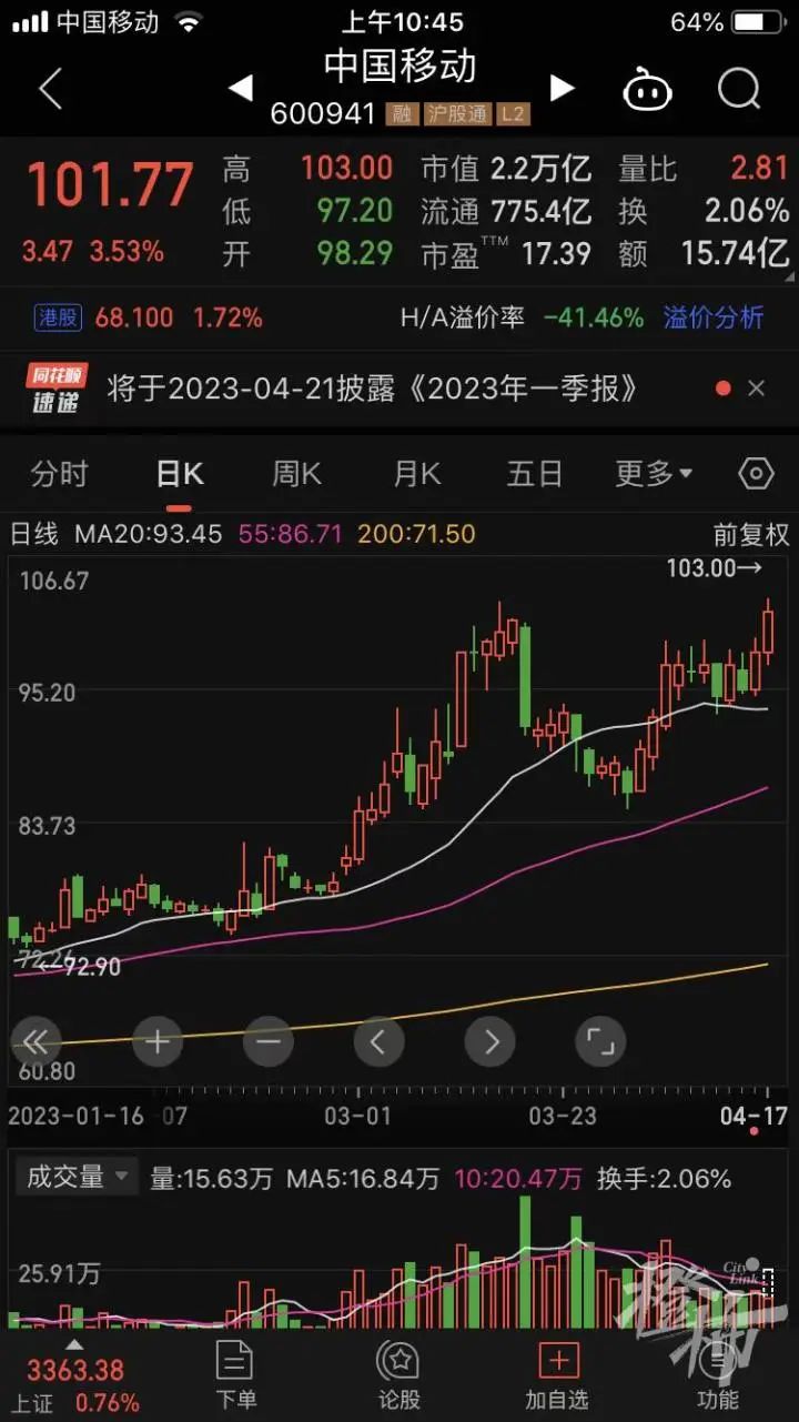 刚刚,“A股股王”易主,中国移动正式超越贵州茅台成为A股总市值最大的上市公司。盘中,中国移动股价最高涨至103元/股,创下历史新高,涨幅超过4%,年内涨幅则超过了50%。