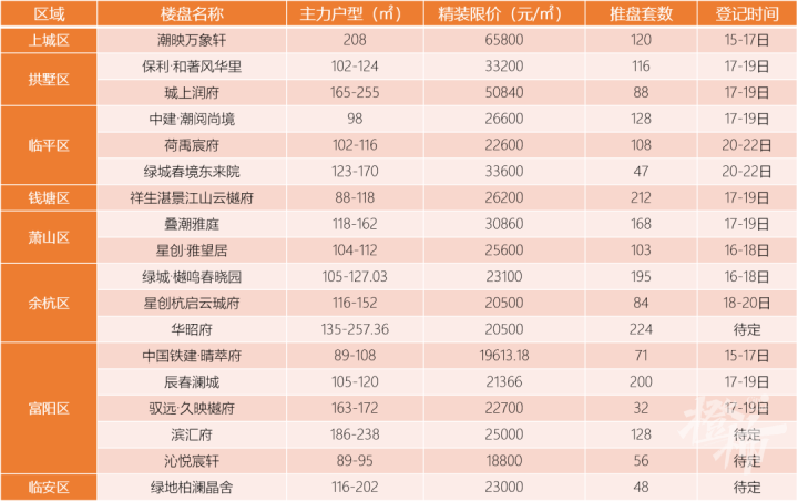 据不完全统计,本周在公示和登记的楼盘共18个,共计推出2128套房源。其中钱江新城二期的潮映万象轩和富阳区的中国铁建·晴萃府登记时间截至今天。