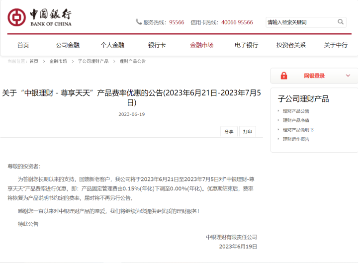 或许是受到了招银理财的“内卷”刺激,作为头部理财子公司之一的中银理财也开始效仿“不收管理费”的做法,于6月21日至7月5日对“中银理财-尊享天天”产品费率进行优惠,将该产品的固定管理费由0.15%(年化)下调至0.00%(年化)。