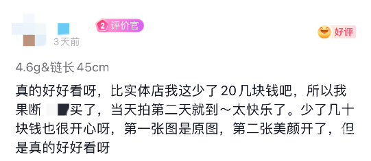 直播间也会推一些限时福利券,减免后可能比实体店略便宜。随便翻看一下某黄金品牌直播间的购买评价,有消费者表示“比实体店少了20几块钱吧……少了几十块钱也很开心”。