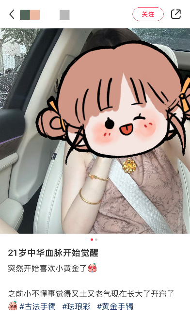 90后的丹丹现在最大的爱好就是穿梭在各大黄金品牌的直播间,看金饰的造型款式,然后去线下实体店下单。对于买金,她有两条原则:第一,过年必买千足金,主要是镯子;第二,日常消费首选饰品金,特别是金项链,款式多造型精美。
