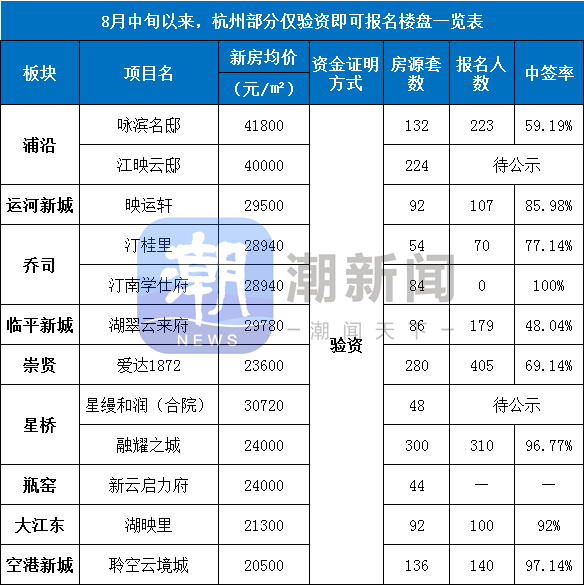 据潮新闻记者不完全统计,自8月中旬以来,已有浦沿、运河新城、乔司、临平新城、崇贤、星桥、瓶窑、大江东、空港新城等十几个板块,主动降低摇号门槛,验资即可报名。