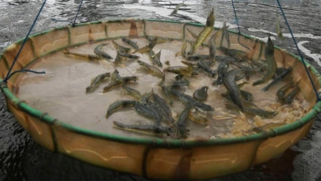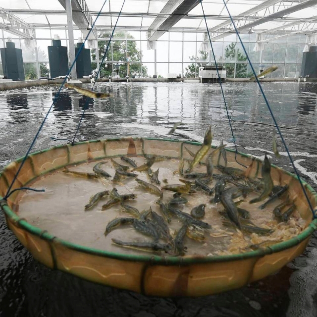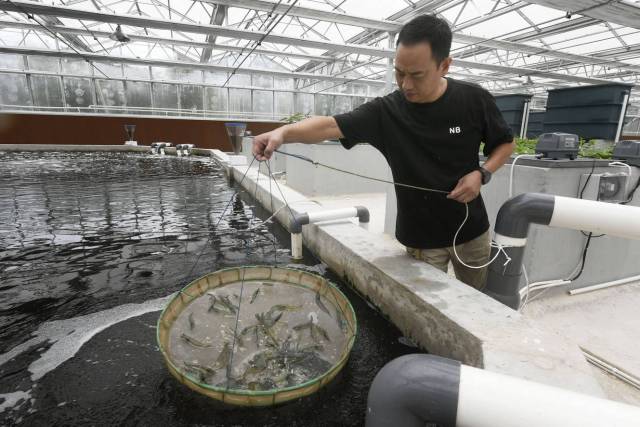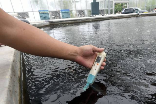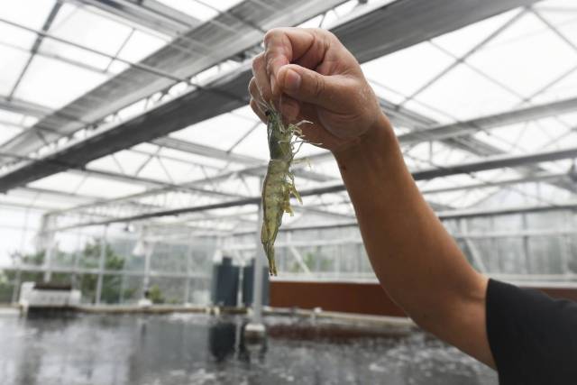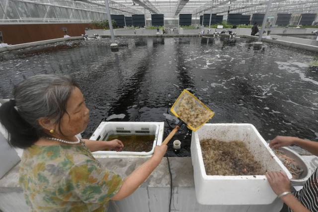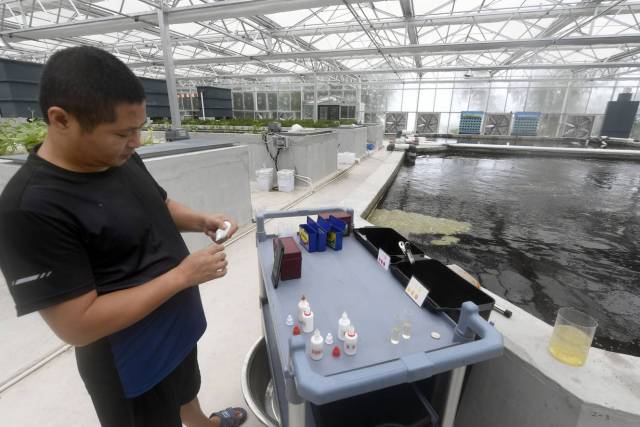 9月13日,在位于建德市更楼街道石岭村的砚然谷“鱼菜共生”共富工坊里,工作人员正在检测海水养殖池内的各项参数,观察南美白对虾的生长情况。预计这里养殖的首批约2000公斤南美白对虾和黑虎虾将在十天内捕捞上市。