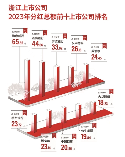 紧随其后的是两家股份制银行——浙商银行和宁波银行,2023年分红总额分别达到44.66亿元和33.02亿元。此外,永兴材料、苏泊尔、杭州银行、雅戈尔、中国巨石等浙江上市公司2023年分红总额也均超过20亿元。