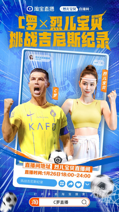 本周五晚6点到12点,球星C罗将亮相淘宝直播间。GST荣耀巡回赛2024利雅得胜利中国行,C罗将率队于1月24日深圳大运中心体育馆对阵上海申花、1月28日对阵浙江队。在两场赛事之间,C罗将亮相“烈儿宝贝”淘宝直播间,挑战吉尼斯纪录。