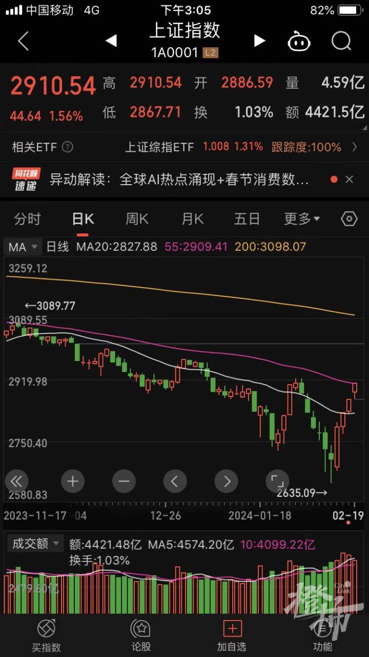 都市快报讯 你今天收到股市红包了吗?龙年春节后首个交易日,A股“开门红”行情如期而至。截至收盘,上证指数涨1.56%收复2900点,深成指涨0.93%,创业板指涨1.13%,两市超4200家上市公司上涨。其中,受到人工智能文生视频大模型Sora刺激的AI板块,表现尤为强劲,包括杭州上市公司当虹科技,前期AIGC龙头股万兴科技、因赛集团等在内的数十家AI概念股掀起了涨停潮。此外,煤炭、石油指数表现强势,中国神华、中国海油创新高,为A股龙年行情开了一个好头。