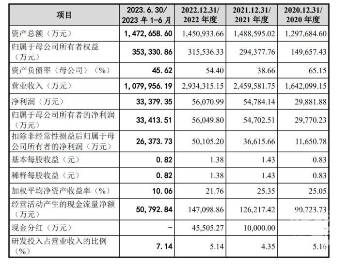招股书显示,2020-2022年龙旗科技营业收入分别为164.21亿元、245.96亿元、293.43亿元,2023年上半年营收108.00亿元;2020-2022年净利润分别为2.99亿元、5.48亿元、5.61亿元,2023年上半年净利润为3.34亿元。