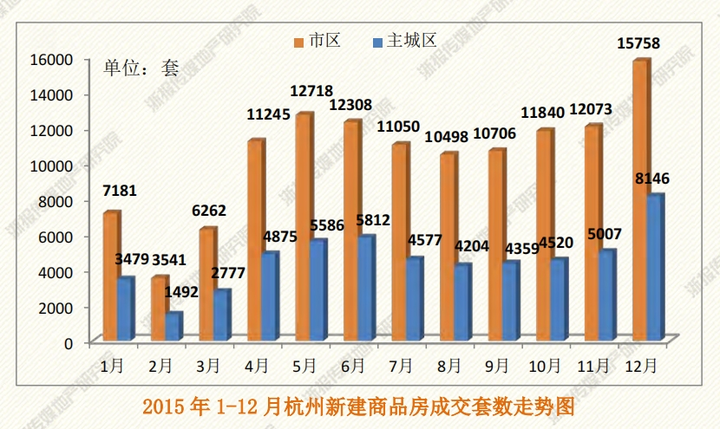 2015年,杭州商品房总成交125180套,超越了2009年的105721套,创新高!从4月开始,杭州连续9个月月度成交量破万套,其中12月单月成交量更是超过1.5万套。