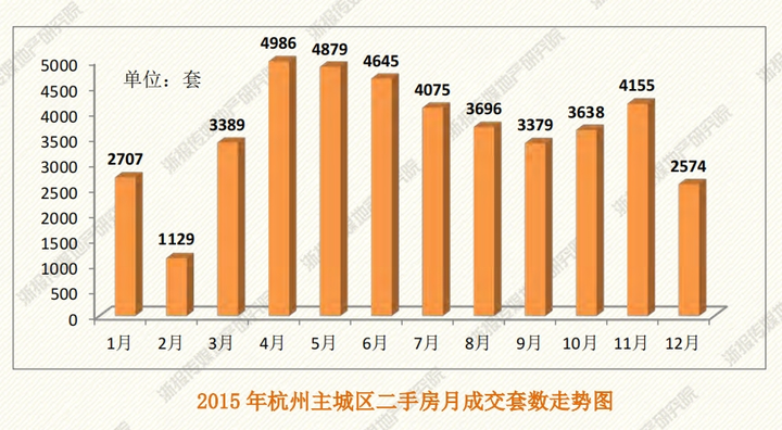 几乎同期,杭州二手房住宅价格指数开始上扬。2015年,杭州主城区二手房月均成交量在3600套左右,4月成交4986套,为全年成交量最高月份。