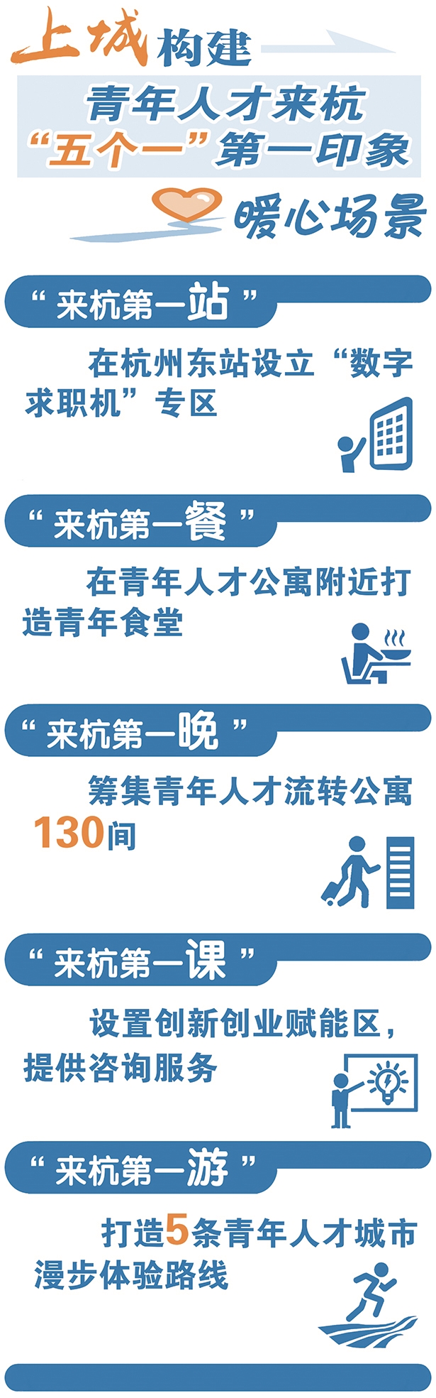 首先是“服务综合体”,即构建青年人才来杭“五个一”第一印象暖心场景,包括打造“来杭第一站”,在杭州东站设立“数字求职机”专区,方便来杭青年人才实时投递简历、提高求职效率;提供“来杭第一餐”,在青年人才公寓附近打造青年食堂,给予来杭大学生就餐优惠,提供质优价廉的就餐体验;升级“来杭第一晚”,筹集“青荷驿站”青年人才流转公寓130间,优化申请流程,方便求职学生线上办理、拎包入住;上线“来杭第一课”,在“青荷驿站”公寓设置创新创业赋能区,提供职业指导师联系方式,给予青年人才简历制作、职业生涯规划等咨询服务;推出“来杭第一游”,打造5条青年人才城市漫步(CityWalk)体验路线,打造“青荷礼包”Plus版,助力青年人才乐游上城。
