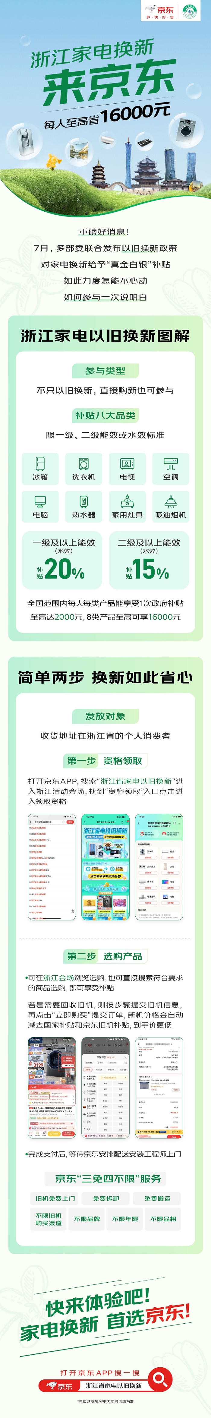 浙江以旧换新落地方案发布,对8类家电产品给予“真金白银”补贴。京东承接了浙江家电以旧换新补贴的线上发放工作,9月5日上线浙江活动会场,收货地址在浙江省的消费者来京东买家电,以旧换新或是直接购新均可领用补贴。全国范围内每人每类产品可领用1次,每人每类产品至高补贴2000元,8类产品至高达16000元。