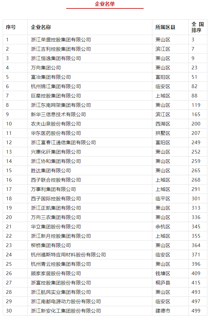 从榜单来看,今年有3家杭企进入全国前十,较去年增加一家,分别是排名全国第2位的阿里巴巴(中国)有限公司(9274.94亿元)、排名全国第5位的浙江荣盛控股集团有限公司(6126.06亿元)和排名全国第10位的浙江吉利控股集团有限公司(4980.72亿元)。