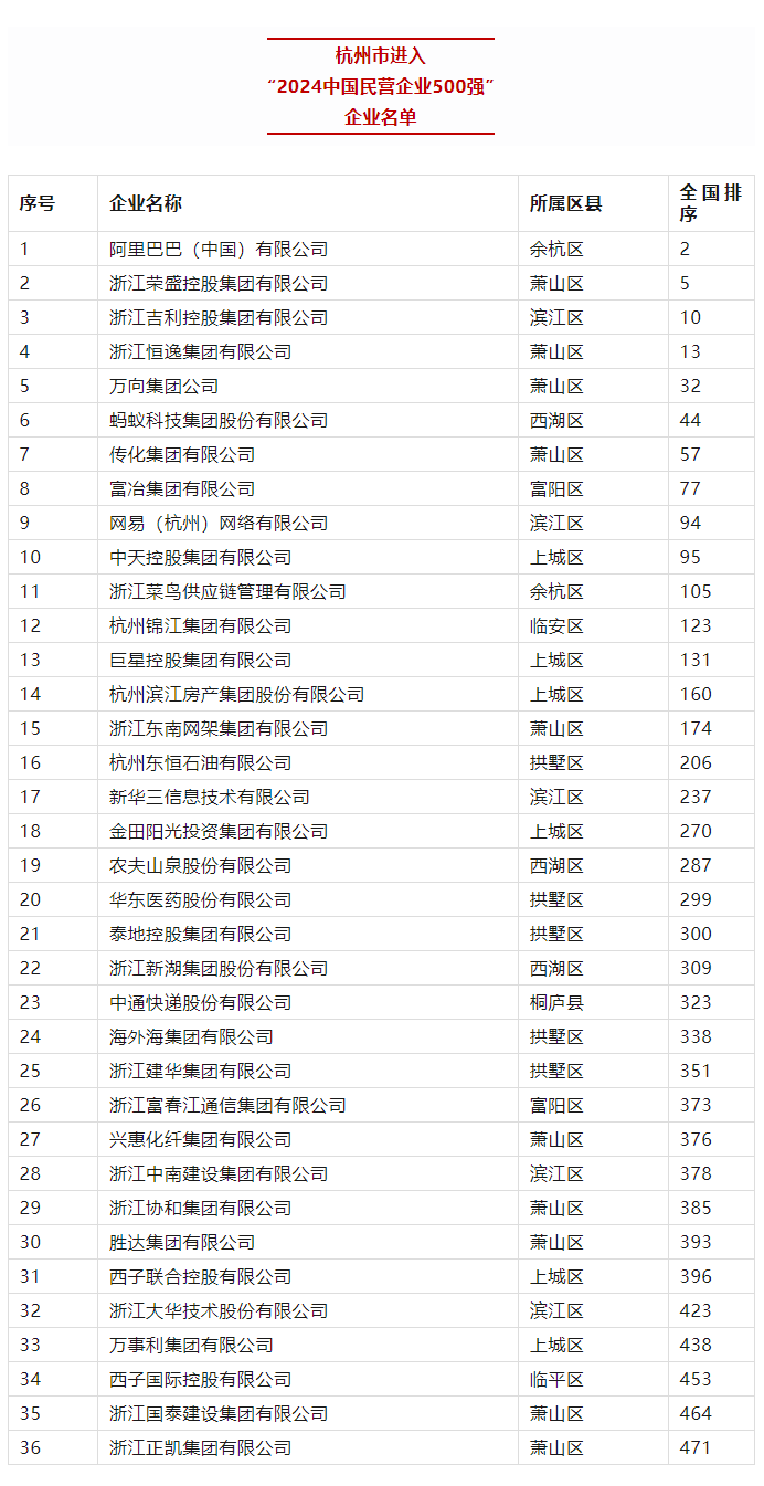 今天,全国工商联正式公布“2024中国民营企业500强”榜单,杭州市有36家企业上榜!杭州市上榜的企业数,已连续22年蝉联全国城市第一!