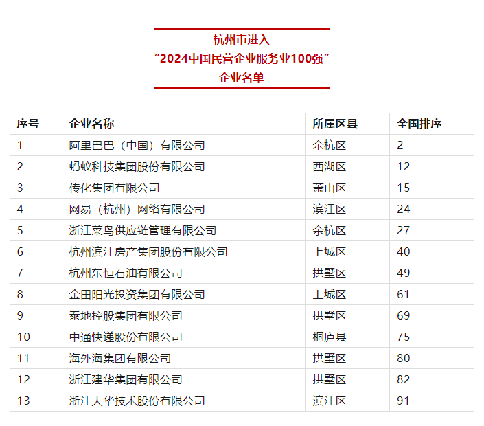 全国工商联还同步发布了“2024中国民营企业制造业500强”和“2024中国民营企业服务业100强”榜单。杭州市有30家企业进入“2024中国民营企业制造业500强”行列,占全国的6.00%,占浙江省(109家)的27.52%;有13家企业进入“2024中国民营企业服务业100强”行列,占全国的13.00%,占浙江省(19家)的68.42%。