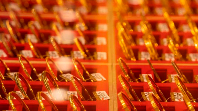 在四周明亮灯光的照射下,各个门店的首饰柜台中,金灿灿的黄金饰品在红绒布的映衬下,简直亮瞎眼。