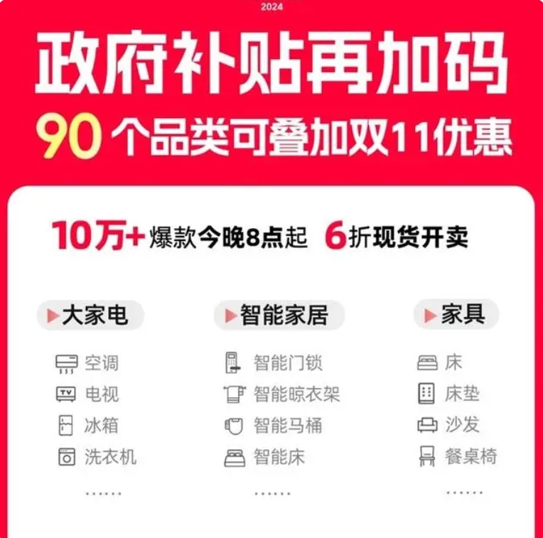 据了解,在大家电基础上,天猫双11现货开售期,新增小家电、智能家居、家具、手机、电脑、影音数码等90余个品类,可叠加天猫双11优惠,超10万款大牌商品低价现货开卖。值得一提的是,消费者直接购新或以旧换新,均可使用政府补贴,下单时直接立减。