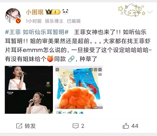 比如,天后王菲的“虾片耳环”,让不少网友惊呼“有些人就是与生俱来的时尚感”,戴个塑料都好看。没想到,网友迅速就扒出了同款——虾片。