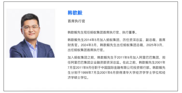 今日蚂蚁官网更新,蚂蚁集团前总裁韩歆毅(Cyril)正式接任蚂蚁集团CEO一职。
